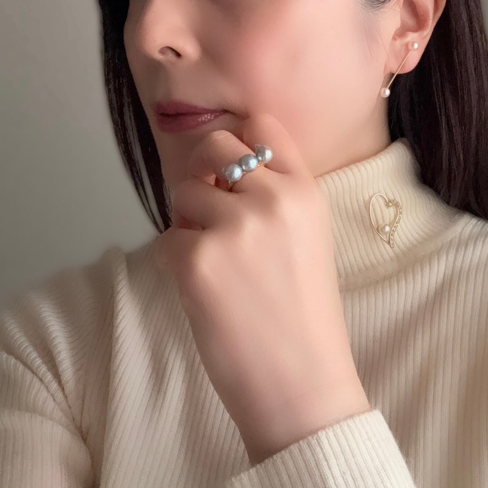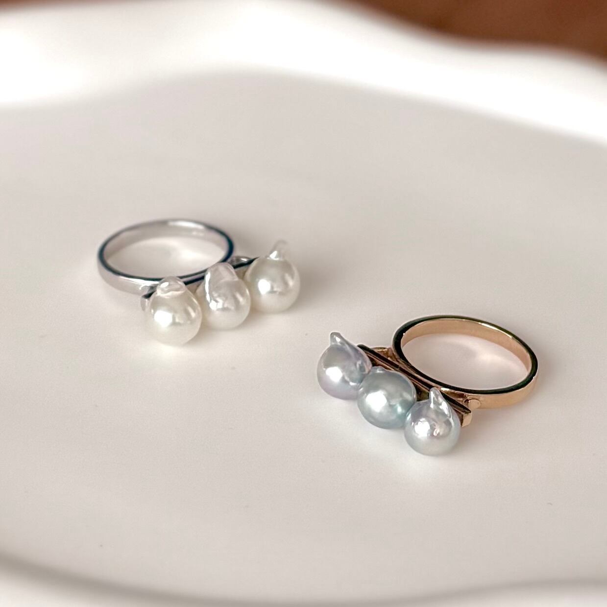 そんな願いに応えるために生まれたのが、あこやバロックパールを贅沢にあしらった3連リング。リングサイズは、多くの方に心地よくフィットする 使いやすい13号です。